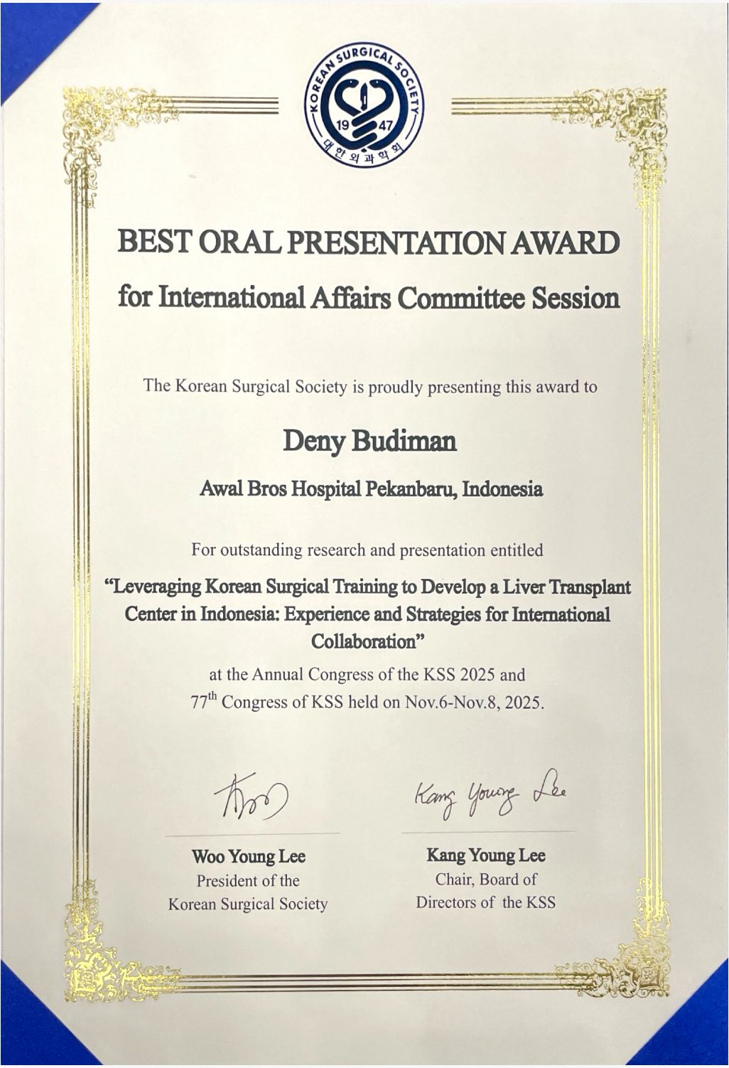 dr. Deny Budiman berhasil meraih Best Oral Presentation Award pada sesi International Affairs Committee dalam ajang Annual Congress Korean Surgical Society (KSS) yang diselenggarakan pada 6–8 November 2025. Penghargaan ini diberikan atas presentasi penelitian berjudul: